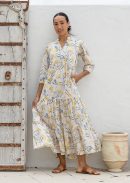 Looking for the perfect blend of comfort and style? Look no further than our Blue Acacia Tiered Maxi Dress, with a soft blue and golden floral print scattered over a warm neutral base. This stunning boho-inspired dress is the ideal choice for any occasion. Featuring a buttoned bodice with a V-neckline and mandarin collar, convenient pockets, a tiered, flowing maxi skirt and 3/4 sleeves. Looks equally gorgeous loose or belted for a defined waist. Be ready to turn heads and feel confident in this must-have addition to your wardrobe. Looks great belted too.